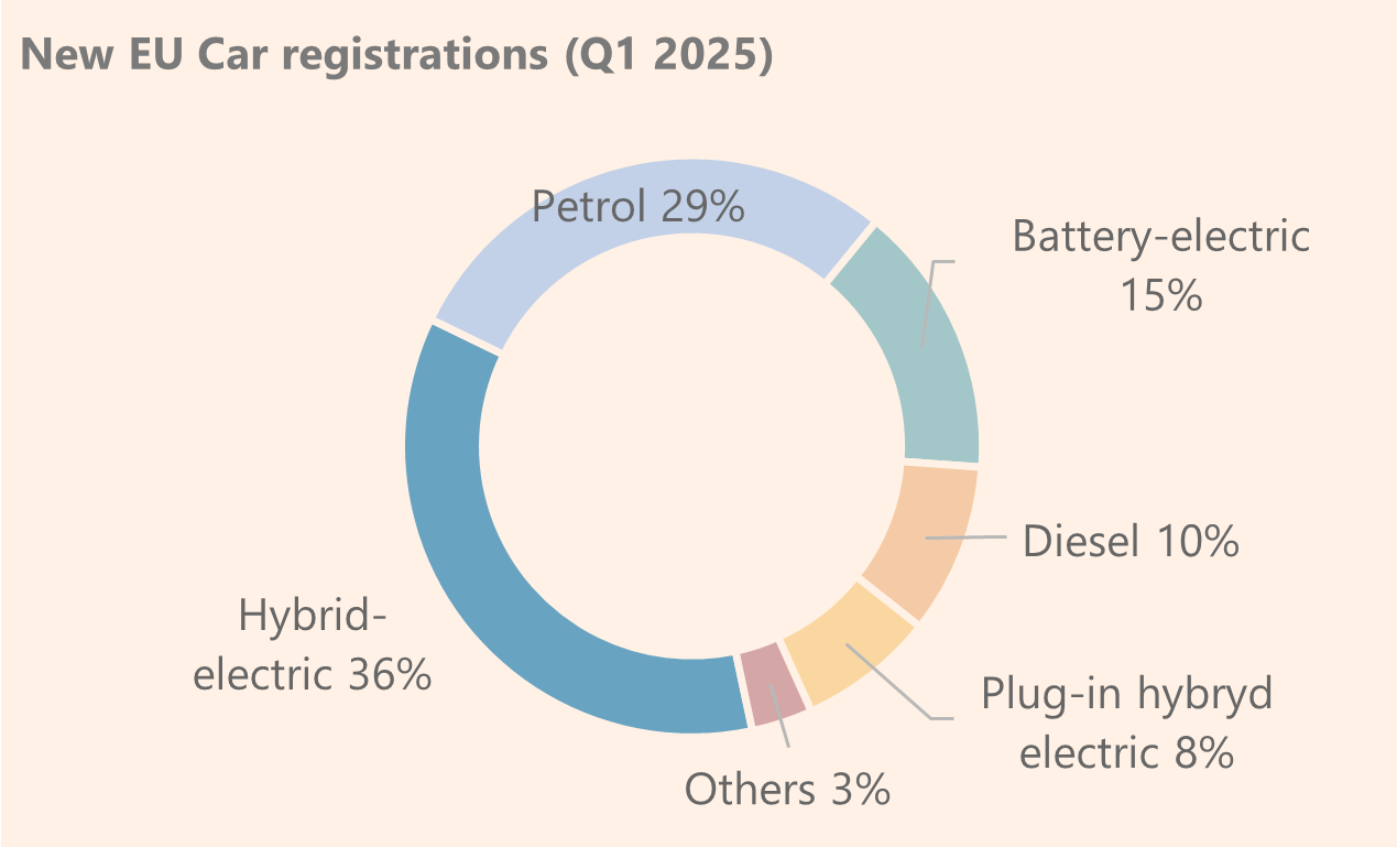 This dynamic is clearly seen in the European Union, where consumers are opting for hybrid technologies, with diesel and gasoline still accounting for 38% of new vehicles.