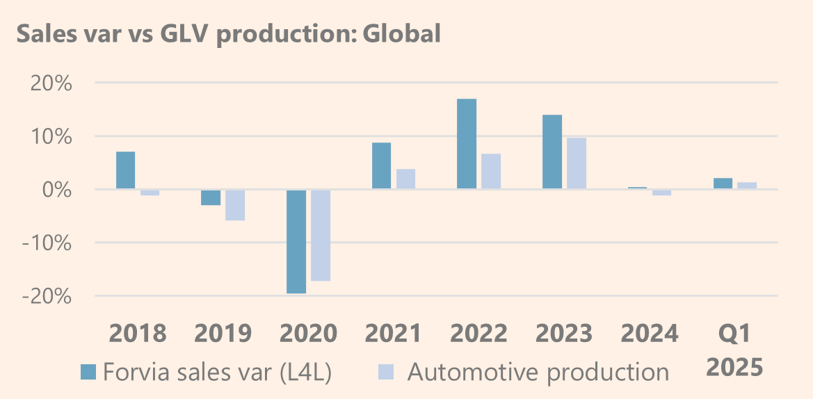 Since 2017, Forvia has historically grown at rates above global vehicle production (like-for-like). While global production fell by 1% annualized between '17 and '24, Forvia grew at rates of 2.8%.