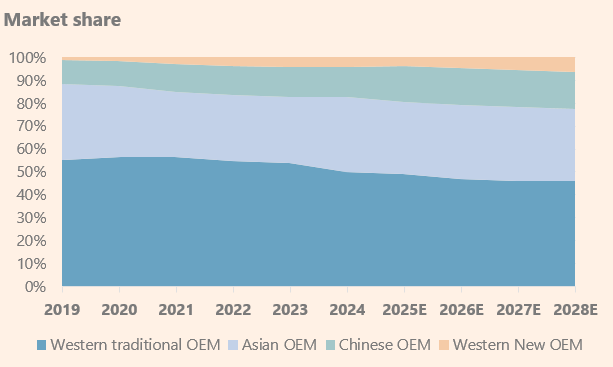 The annualized growth expected by analysts until 2028 is 10% for Chinese OEMs, 4% for Asian OEMs ex-China, and 2.6% for traditional OEMs. This leads us to a 2028 where traditional OEMs still account for around 45% of the market share. In my opinion, Forvia will be there.