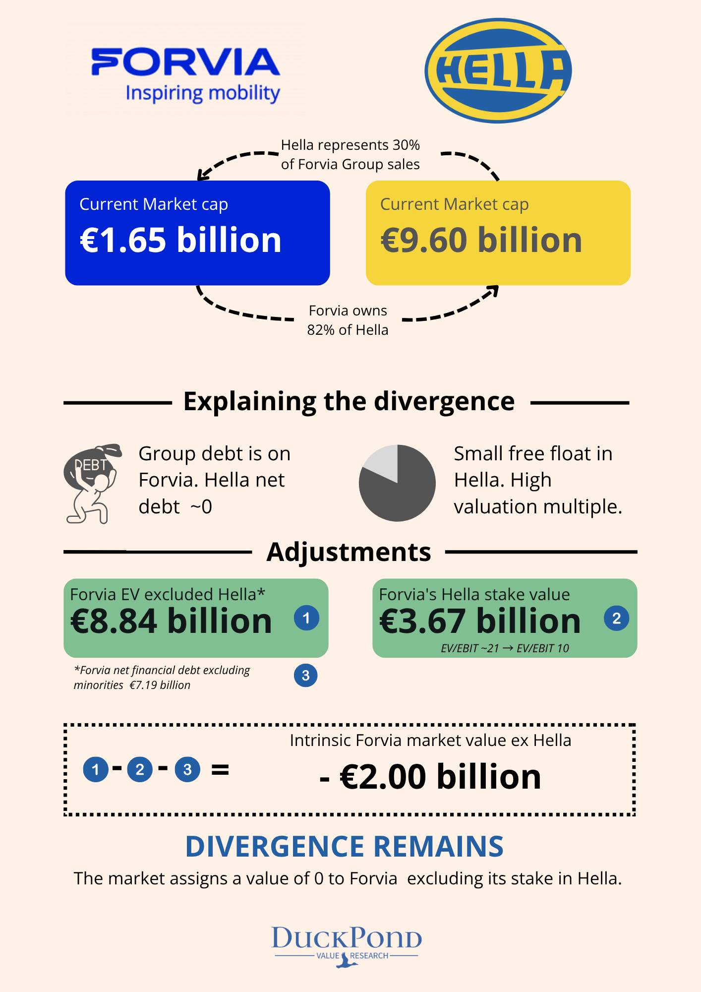 However, Forvia's current market cap is €1.65 billion compared to Hella's €9.6 billion. It's easy to assume that Forvia's stake in Hella is worth €7.87 billion, which is more than Forvia's entire valuation. This is an incredible price divergence, although two observations must be made: