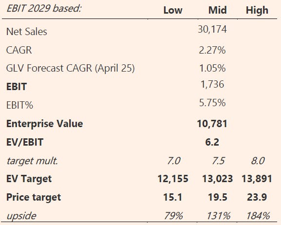 This scenario leads to 30 billion in Revenue and an EBIT of 1.7 billion, close to 6% of sales.