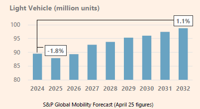 It's true that the global annual vehicle production level remains below 2019, mainly due to the real estate and financial crisis in China. The tariff chaos has delayed the recovery to pre-pandemic levels until virtually 2029, but sustained growth is generally expected with a 1.1% annually until 2030.