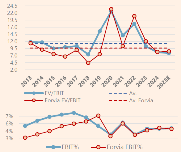We are going to value the company using EV/EBIT because this multiple allows for the unification of criteria between companies (some competitors and Forvia capitalize R&D as an asset) and the analysis of previous cycles.