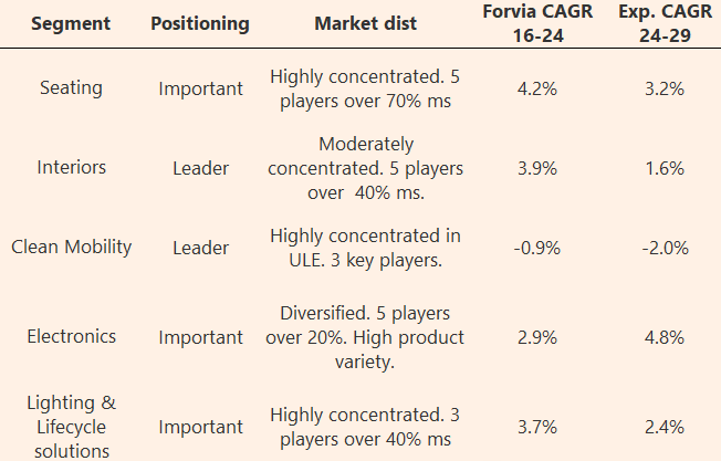 Interiors: Trends such as autonomous driving will increase the importance given to the vehicle's interior. Lower technological barriers and higher competition make this segment weaker in terms of margins, although Forvia's competitive position and joint offering, combined with a restructuring plan, could sustain the segment's growth.