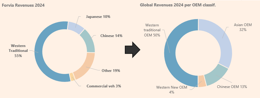 1️⃣Automotive is a struggling sector where the viability of clients such as Stellantis, Volkswagen, Ford, Mercedes (45% of 2024 sales) is in doubt due to electrification and Chinese competition. And Forvia owes most of its revenue to these customers.