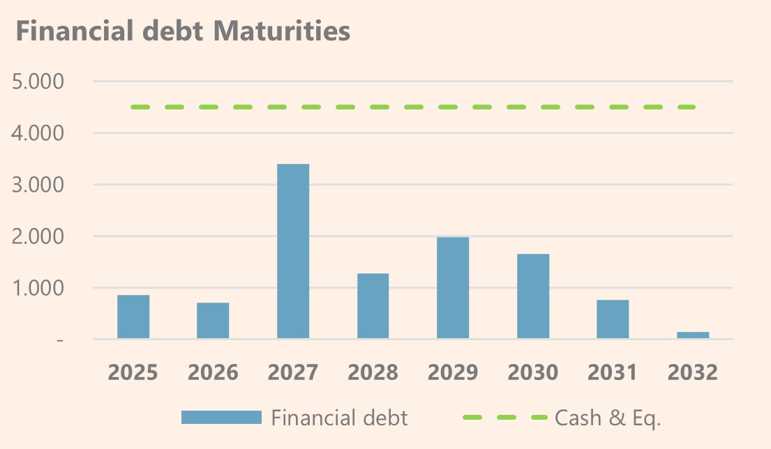 Despite the high debt ratio, Forvia has no significant maturities until 2027 and has been consistently reducing its debt since 2022. Concurrently, it is implementing an aggressive restructuring program, reducing 2900 employees in 2024 and an additional 2700 in 2025 (4% of workforce) related to its EU-FORWARD program. The expected annual savings from the program are up to 500 million euros starting from 2026.