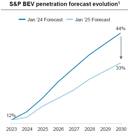 Delayed penetration of BEV: Since 2019, the penetration forecast of the total number of vehicles has been falling steadily. The latest revision puts it at 33% and government plans have been relaxed.