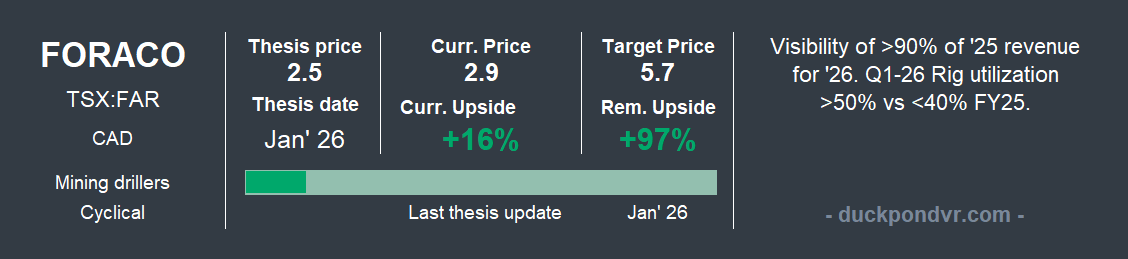 Tim Brenner, CEO of Foraco, confirmed that in Q1 2026, they have already surpassed 50% rig utilization (compared to a 36% average in 2025) and expect to maintain a steady 67% utilization rate. In my projections, maintaining 50% utilization throughout 2026 alone would imply a revenue increase of more than 30%.