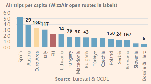 This pricing ceiling could begin to break with higher growth in per capita income in WizzAir's core economies (which would also drive higher load factors) and with growing tourist interest in these regions. Indeed, the economies where the airline operates still have significant room for convergence with the EU and Euro area averages.