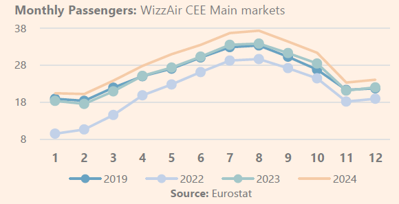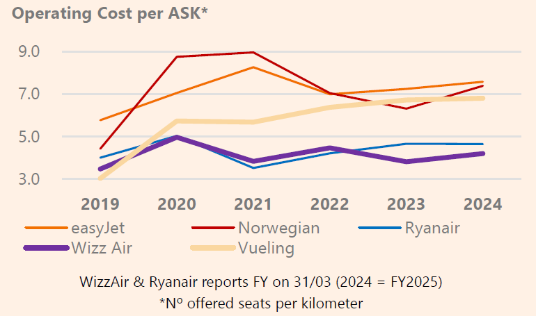Despite a net increase in the equivalent fleet of 35 aircraft (+20%), ASKs remained flat due to the grounding of 42 planes because of the P&W engine issues. This occurred during a fiscal year (April 2024 - March 2025) when the sector's recovery in Europe reached pre-pandemic levels, even surpassing them in Central and Eastern European (CEE) markets—WizzAir's core markets.