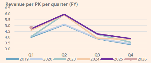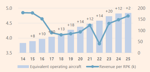 Revenue per passenger-kilometer (RPK) grew by 1.6% in FY25, following 7% growth in the prior year. In Q1 FY26, it increased by 2%, but the company has issued guidance for Q2 (the summer peak) to be flat year-over-year. (Source: Q1 FY26 web conference).