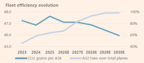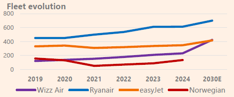 The company aims to converge towards a model where 40-50% of the fleet is owned by 2030-2032, seeking to improve its credit rating and, consequently, its cost of capital, bringing it closer to Ryanair's.