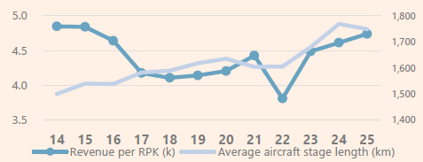 RPK (Revenue per Passenger-Kilometer) decreased as the company operated longer routes up until 2018. Longer routes generate lower RPK because the fixed costs of getting an aircraft "in the air" (such as airport fees) are spread over more kilometers. The lower marginal cost of additional flight hours compared to the fixed costs allows for a lower unit price per kilometer.