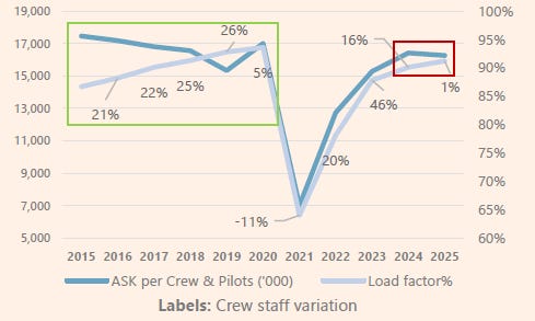 Cabin crew headcount increased by 1%, versus a 0.06% decrease in ASKs. The company expects fleet growth in the coming years and needs to increase staffing in advance, thereby accepting a degree of short-term inefficiency. This can be observed in the following chart: in periods of growth (green area), headcount increases at a faster rate than total ASKs, reducing productivity as measured by ASKs per employee. In the red area, despite an increase in the load factor, productivity has declined due to a larger increase in personnel.