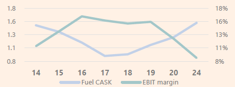 As we can see, as the load factor recovered post-pandemic (Q2 2022 – Summer 2021), the allocation of the fleet's depreciation cost began to normalize (the pre-pandemic level was €0.55 cents per ASK).