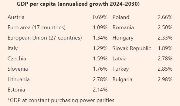 GDP per capita growth forecasts from the OECD through 2030 show higher growth rates in the economies where WizzAir has its main presence.