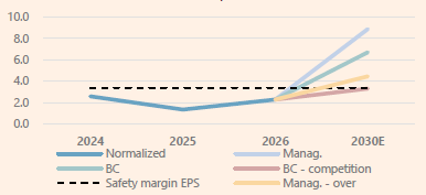 The dotted line, 'Safety Margin EPS,' represents the 2030 EPS required to justify an 80% return on the current price, assuming an exit P/E multiple of 8x.