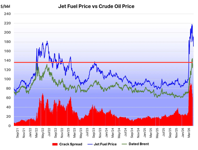 Despite the war continuing, embargoes, and supply difficulties, jet fuel found its way back to $80-100 per barrel before the current shock. If production capacity in the Gulf is not destroyed and the Strait reopens, the medium-term impact could be even more contained than in 2022, despite being a significant short-term disruption.