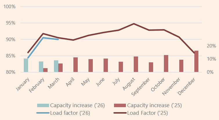 Monthly KPIs show that in FYQ4 2026, load factor was 88.3% vs 89.4% the prior year. With seat capacity up 9.3%, one percentage point less occupancy is reasonable in the weakest quarter of the year with that level of supply growth. So far, so normal.