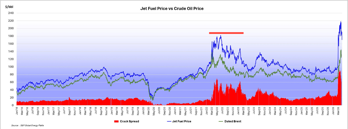 The closest mirror for the current fuel crisis is 2022. When Russia invaded Ukraine, jet fuel prices surged dramatically, reaching $180 per barrel and sustaining an average of $140-150. In the current crisis, prices have reached and held $200 per barrel — potentially the worst energy shock ever recorded.