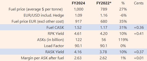 Fuel costs measured as Fuel per ASK rose from 1.17 € cents to 2.00 € cents, an increase of 0.83 cents per ASK, against a Revenue per Passenger Kilometre increase of 0.68 cents per ASK. Results were partially masked by improved load factor (88% vs 78%), though the FY2022 baseline still included part of the pandemic period.